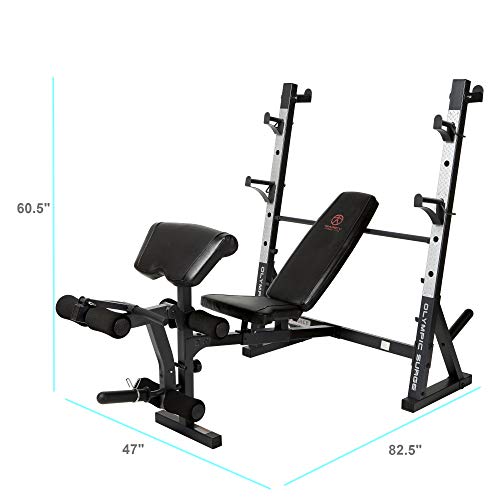 Details: Amazon.com Work your chest, shoulders, biceps, legs, and more without trudging to the gym day after day with the Marcy MD 857 Olympic surge bench. The MD 857 is built tough, with a durable steel frame, upholstery-boxed padding with high-density foam for comfort, and a long-lasting powder-coat finish. More significantly, the bench makes it easy to perform a wide variety of exercises. The bench's adjustable seat and back pad, for instance, operate on a slide track that places the exerciser in the correct posture for military and chest press exercises. At the same time, the bench includes an adjustable preacher curl pad and a detachable bicep bar, so you can isolate your biceps for better bulk. To accommodate your legs, the MD 857 includes a dual-function leg developer with a pivot point and locking mechanism. The pivot point aligns the developer with your knee joints for improved efficiency and safety, while the locking mechanism lets you perform abdominal exercises while seated on the bench. The bench even offers a reverse walk-in squat feature for working your quads in an upright position. Other features include contoured foam roller pads, adjustable bar catches, akimbo-style crutches with diamond striker plates, and two Olympic weight storage posts. Designed to fit Olympic-size barbell and weight plates, the bench measures 80 by 60 by 47.5 inches (W x H x D) and carries a two-year limited warranty on parts. Product Description Gaining your desired body shape requires hard work, discipline, and the best training exercise equipment. Make sure to get all of the benefits of exercise with the Olympic Surge Bench from Marcy! Created to combine superior functionality and utmost convenience, this fitness gear offers you a gym station right in the comforts of your home! This fitness system is made out of rugged steel, foam, and vinyl. A heavy-duty tube frame completes the durable structure of this equipment. The powder-coated finish, the club-style akimbo uprights, and the high quality steel work effectively resists damage from intense use, guaranteeing you an investment that is built to last! With the Marcy MD-857, you no longer need to leave the development of your underworked muscle groups to chance. Utilizing the four back pad positions allows you to pinpoint your pectoral workout, while the adjustable arm curl support pad and arm curl bar make total arm exercises simple and effective. One of the unique features of this bench is the inclusion of two bar catches on the rear of the frame, which gives you the space and freedom to perform squats. You also won’t have any excuse for missing out on leg day, as this fitness equipment has a leg workout station that lets you add some muscle to your lower body. This dual-function leg developer features a locking mechanism for performing abdominal exercises. Achieve a stronger body without having to pay gym membership fees while simultaneously enjoying the comforts of your home with the Marcy Olympic Weight Bench!